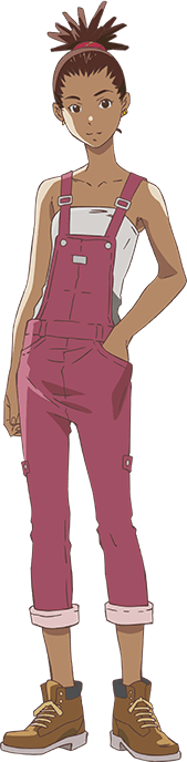 Before bed, she lets her shoulder-length hair down. Her clothing style ranges from casual overalls to a stylish leather jacket and miniskirt.