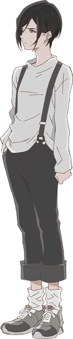 She dresses herself up kind of tomboyish, with a oversized turtleneck white t-shirt and a pair of trousers with suspenders. She wears a gray pair of sneakers with oversized white socks. On her left ear, she has a blue earring.